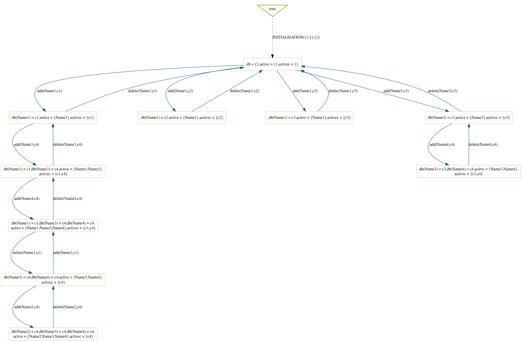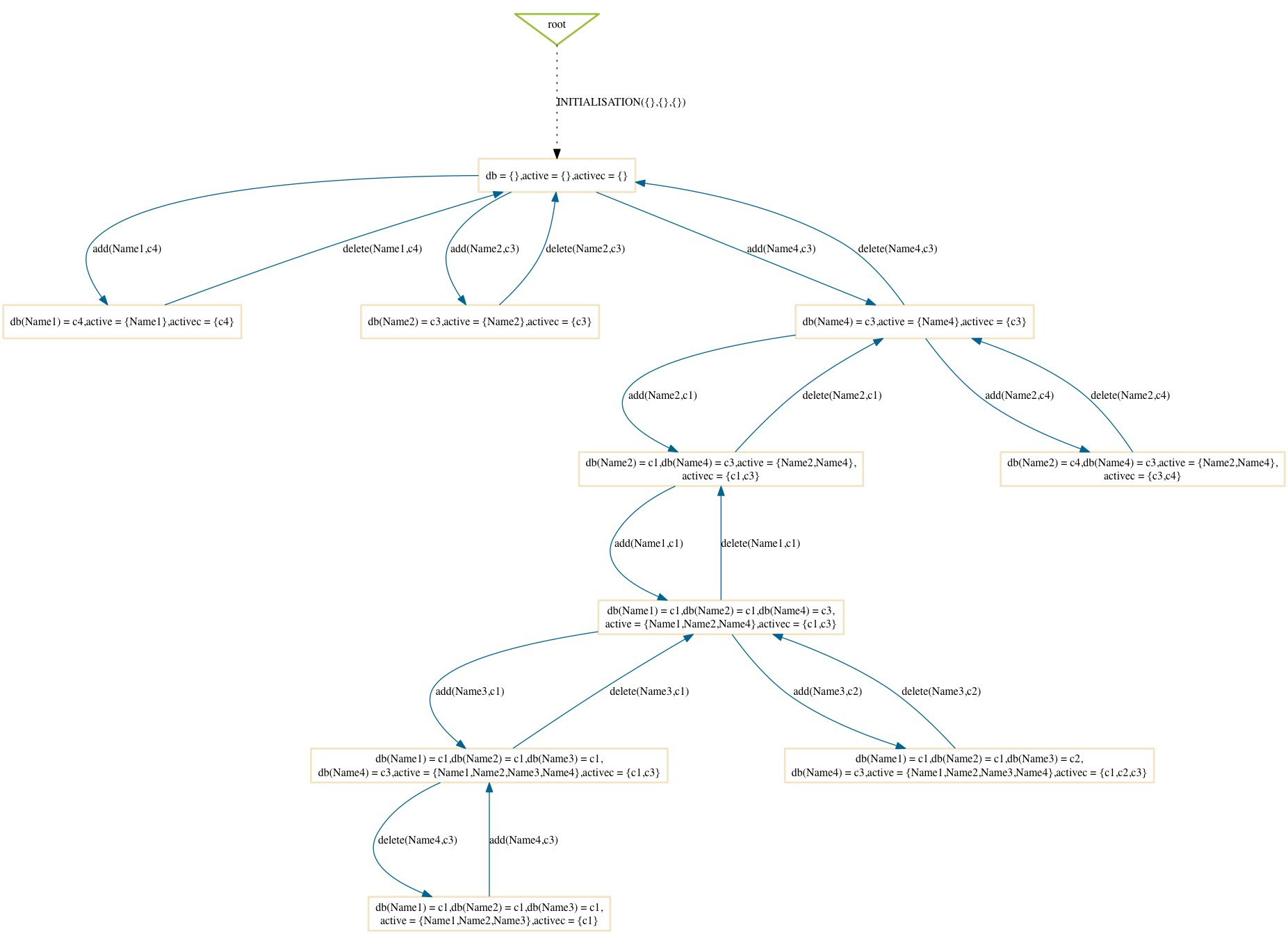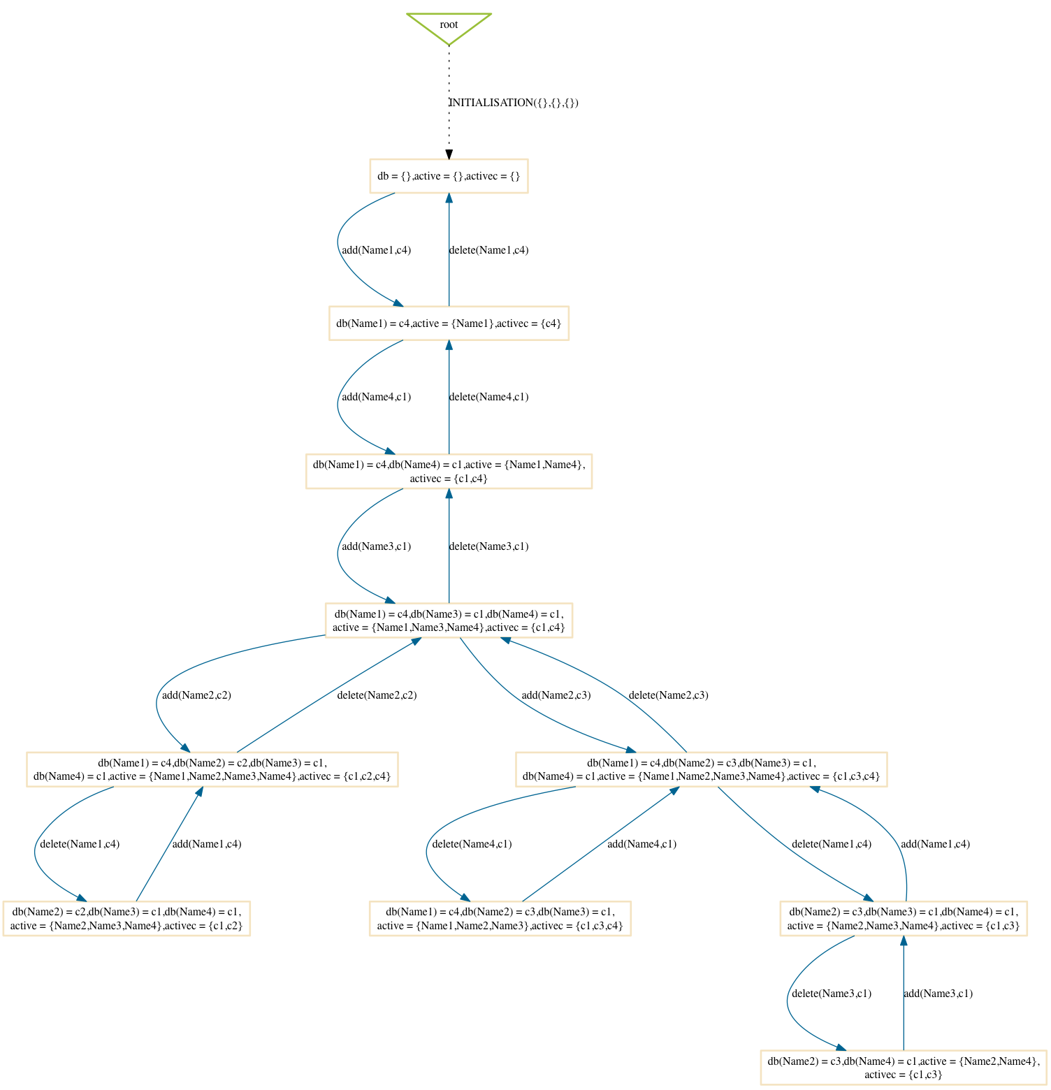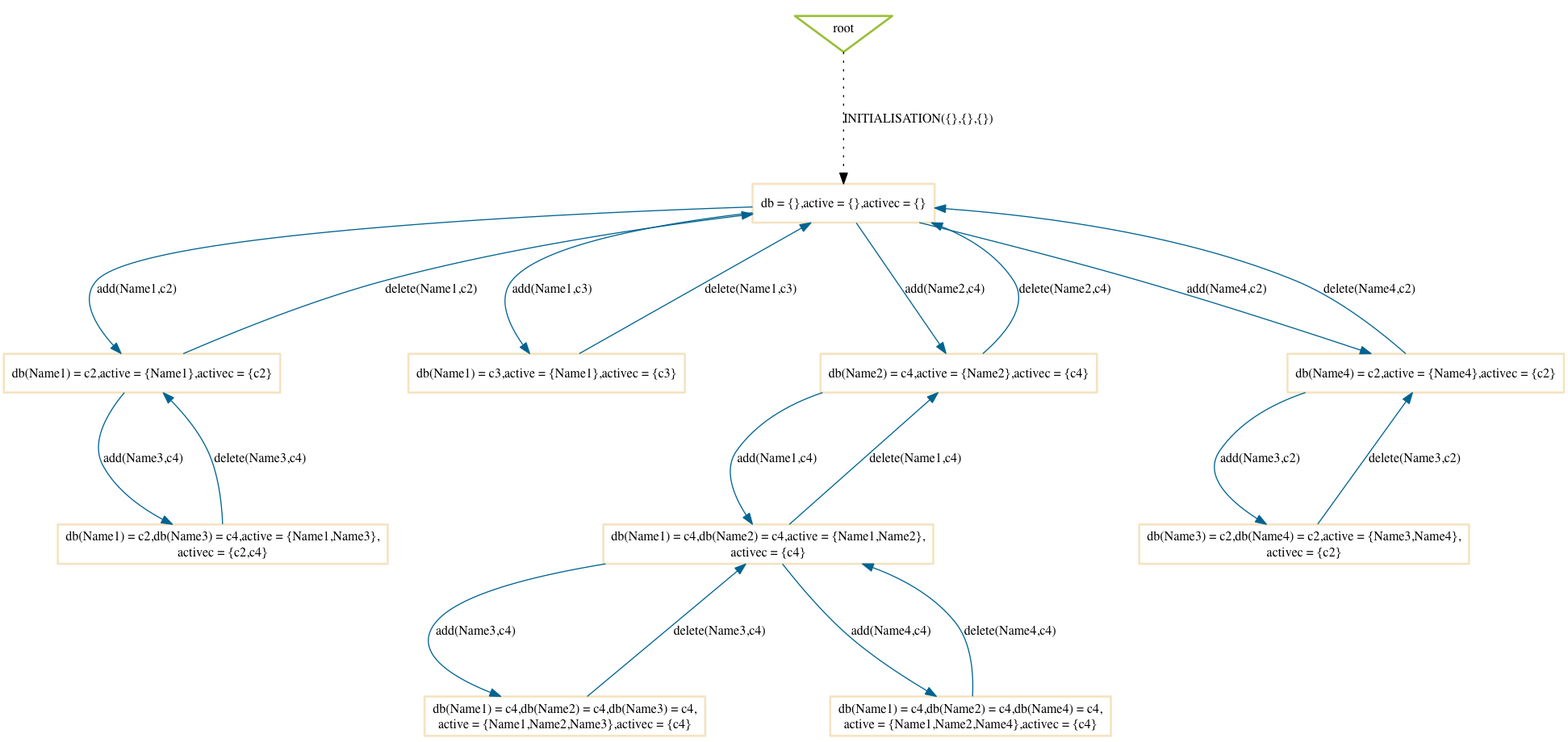 One can notice that ProB here has a tendency to go into depth, as the number of enabled operations decreases: if we add a name to the phonebook, four enabled operations disappear and only two appear (lookup and delete). Note: here it is important to set the MAX_OPERATIONS high enough, otherwise the resulting state space could be different.