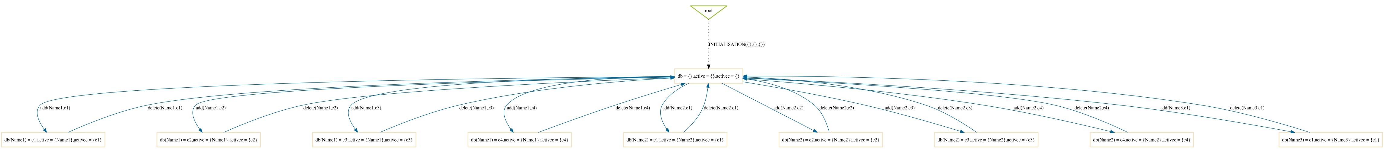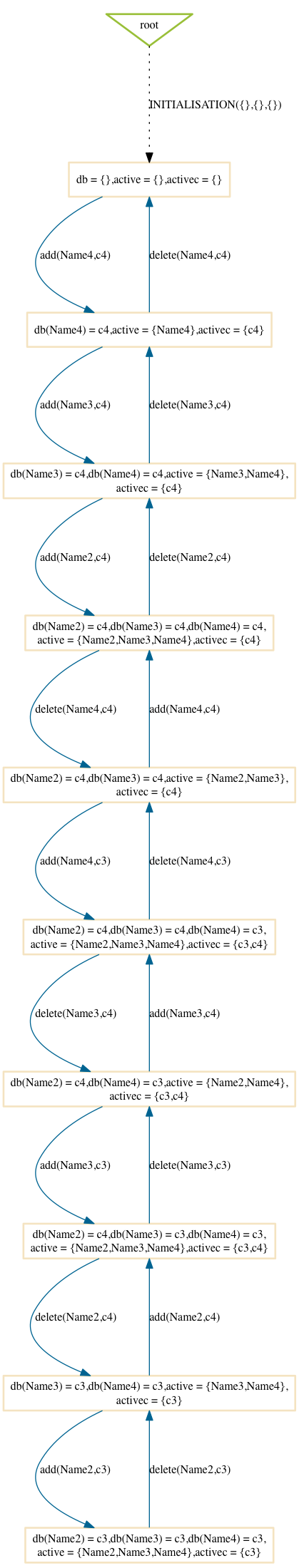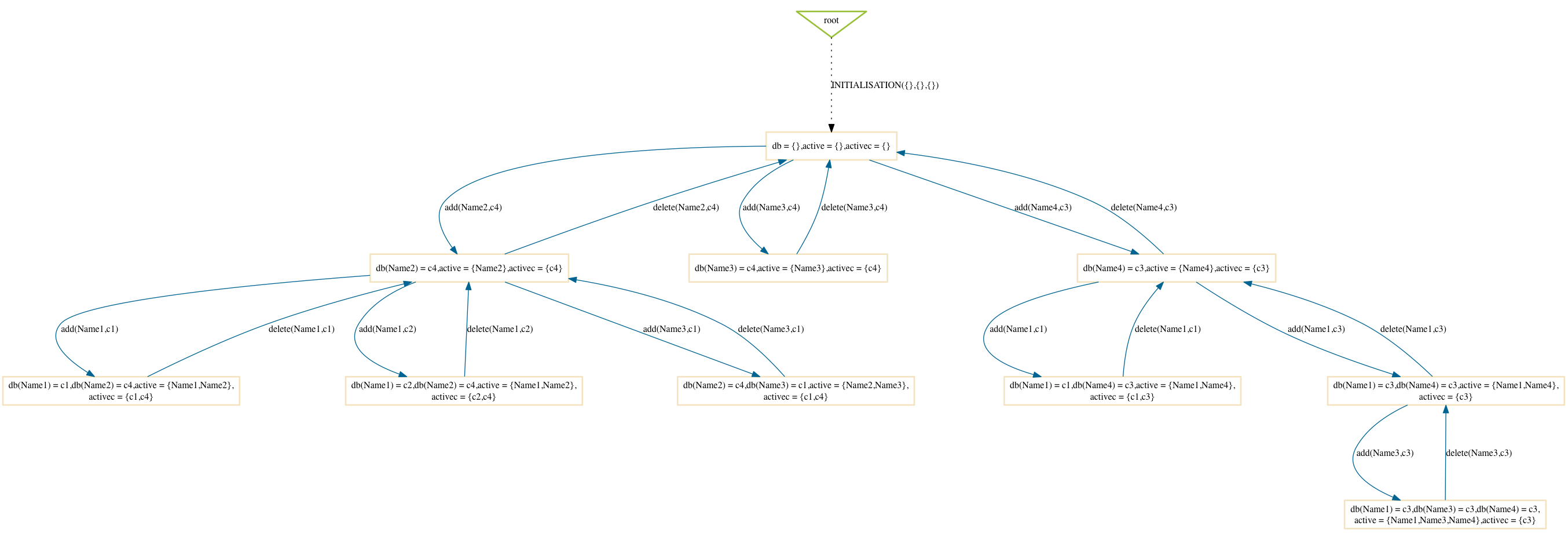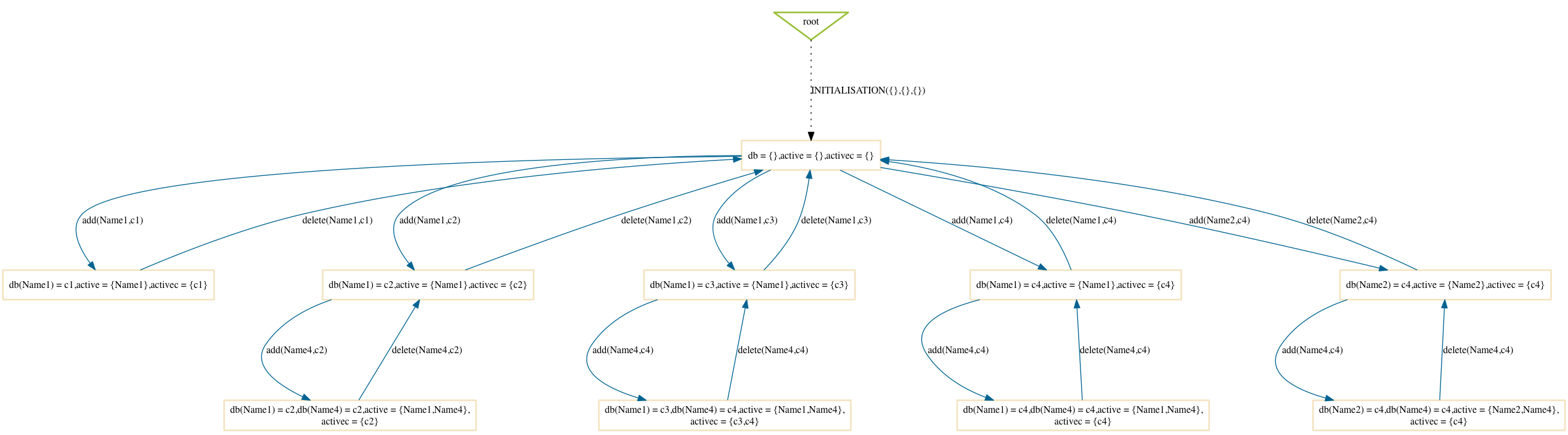 One can notice that ProB here has a tendency to go into depth, as the number of enabled operations decreases: if we add a name to the phonebook, four enabled operations disappear and only two appear (lookup and delete). Note: here it is important to set the MAX_OPERATIONS high enough, otherwise the resulting state space could be different.