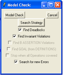 Here we will look a bit closer at the search strategy options of the ProB model checker. You can set the mode using the -mc_mode command-line switch of probcli. In the Tcl/Tk version you can select the strategy in the model checking dialog box (which you obtain via the"Model Check..." command in the "Verify" menu):