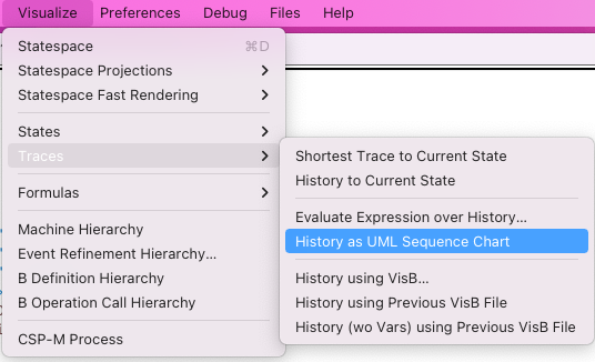 ProB has a new experimental feature to generate a UML sequence chart from the current animation trace using PlantUML. The feature is available in ProB CLI, ProB Tcl/Tk and ProB2-UI. It currently works for classical B and TLA+ models and you need to copy the plantuml.jar file to ProB's lib folder. The file should be named plantuml.jar (without any version numbers).
