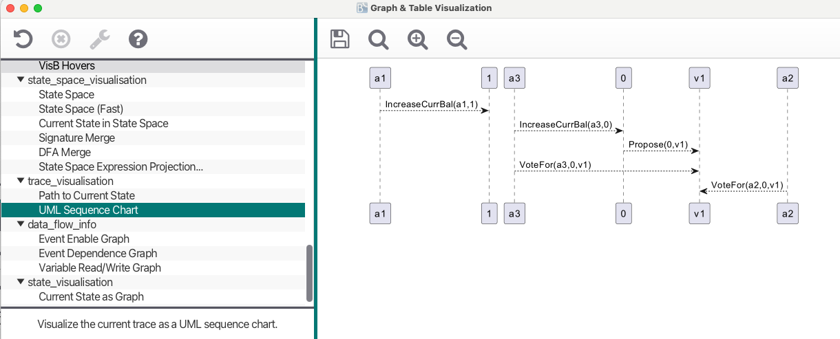 The UML sequence chart is also available in ProB2-UI in the Graph & Table Visualisation View accessible in the Visualisation menu.