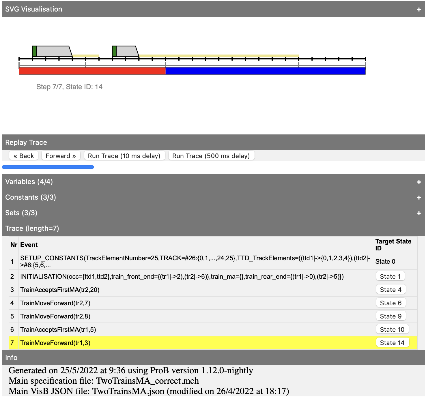 • in ProB Tcl/Tk you can visualise the current state or the history using a VisB visualisation file (it is shown in an external browser) by right clicking in the "State Properties" or the "History" pane.