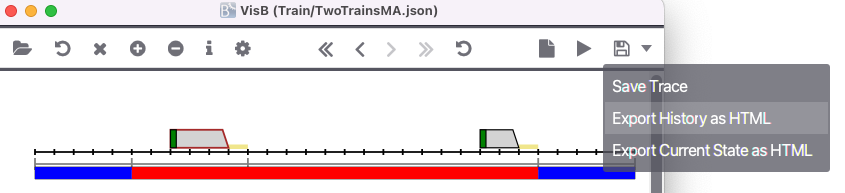 ProB can also export the entire animation history to a standalone HTML file that can be passed to other persons (without requiring access to the B model or to ProB). In ProB Tcl/Tk you can right-click on the history pane and choose "View History in VisB". In probcli you can use the command -visb JSONFILE HTMLFILE to export the history. The command -visb_with_vars JSONFILE HTMLFILE also exports variable values in the HTML file. In ProB2-UI you can click on the export icon in the upper right hand corner: