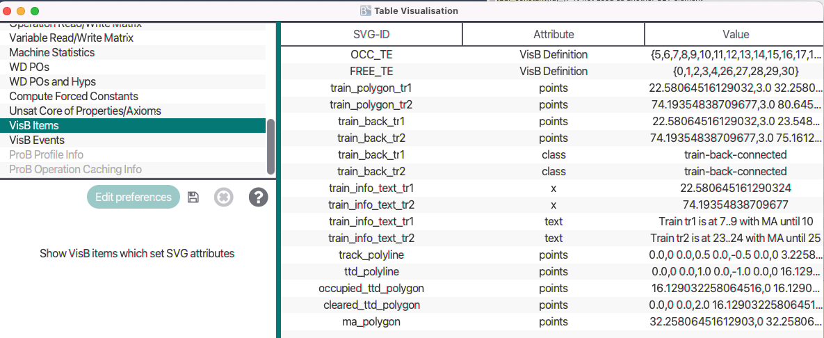 The ProB2-UI table visualisation view (Visualisation menu) also contains tables to help debug VisB items and events: