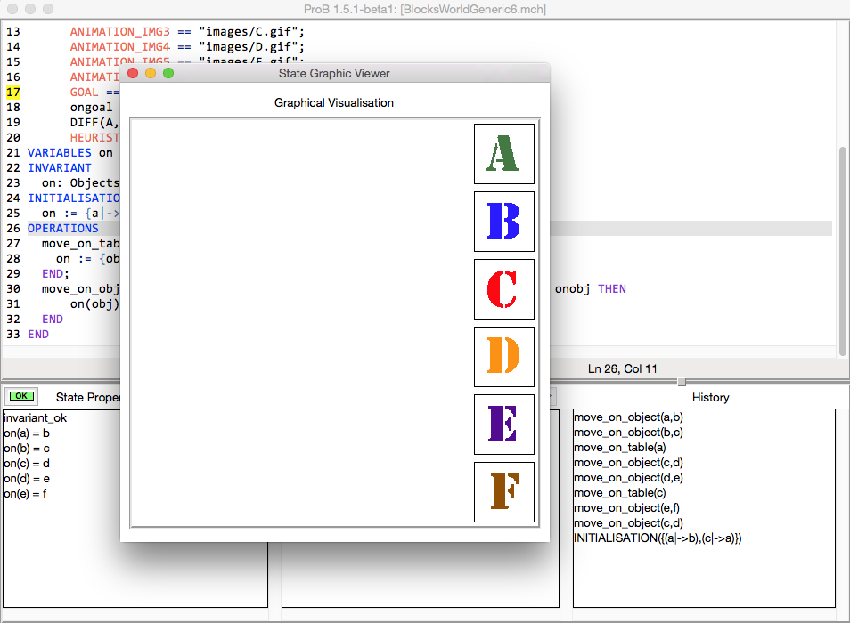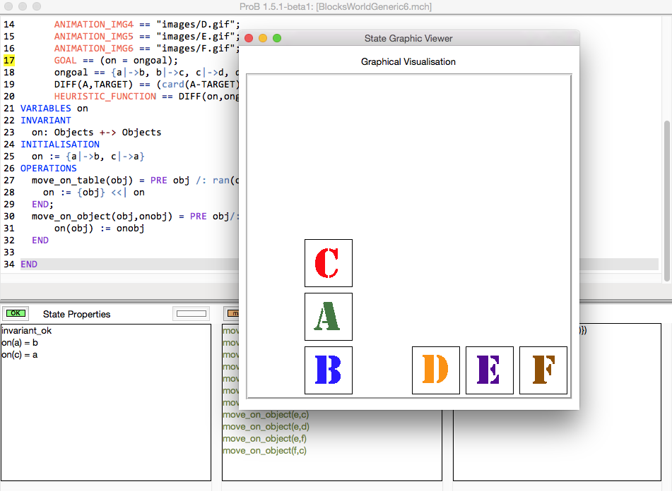 In B we can model this task as follows. We have two operations, on to move a block onto the table and one to move a block onto another one. The initial configuration is specified in the INITIALISATION; the target is specified by the GOAL definition (which the ProB model checker recognises).