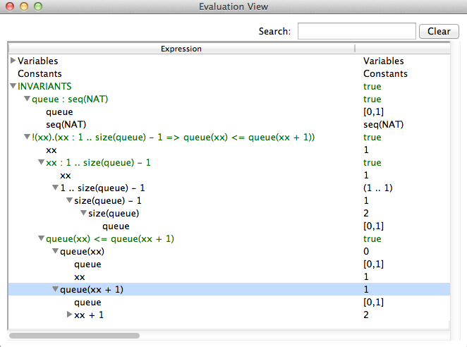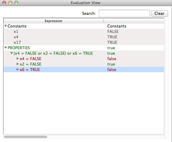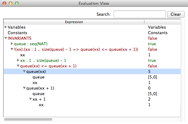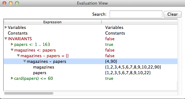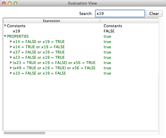 The Analyse Invariant command opens a window displaying the truth values of the various conjuncts of the invariant of the B machine, while the Analyse Properties command plays the same role but for the constant properties and the Analyse Assertions plays this role for the assertions.