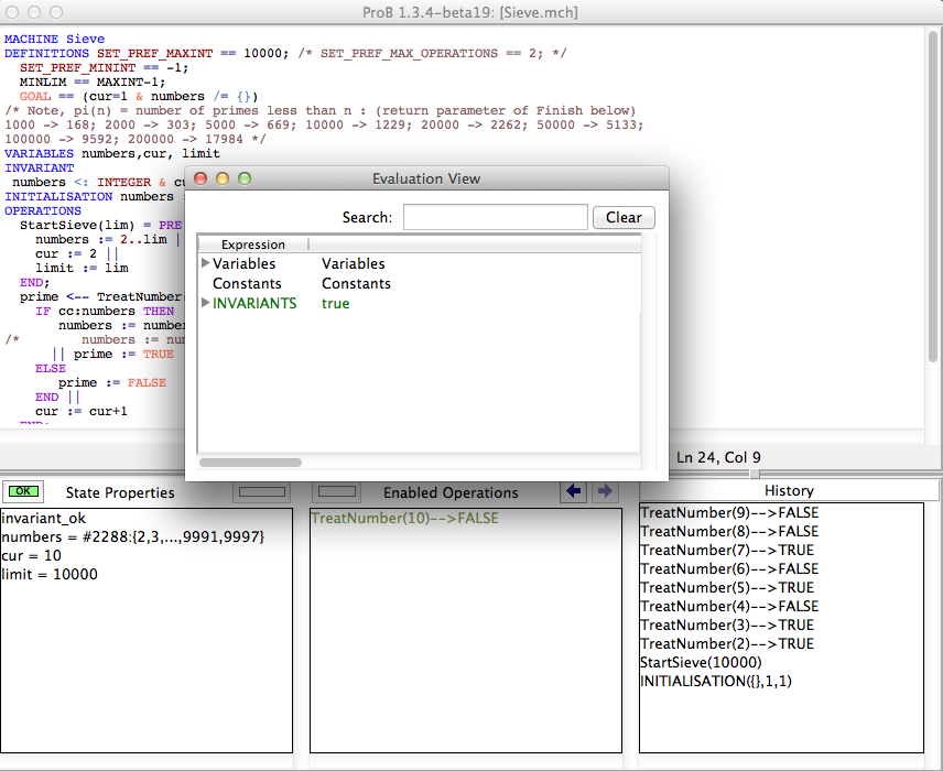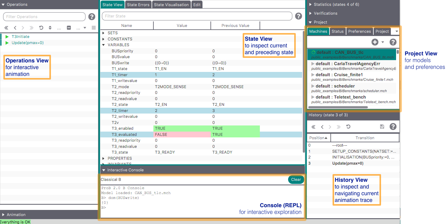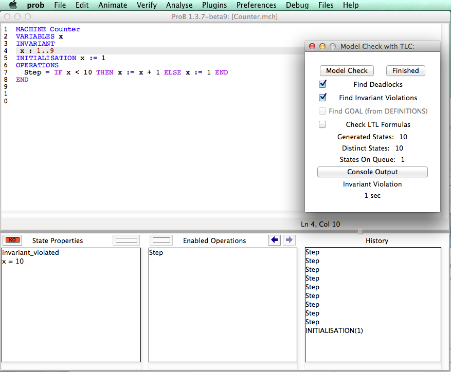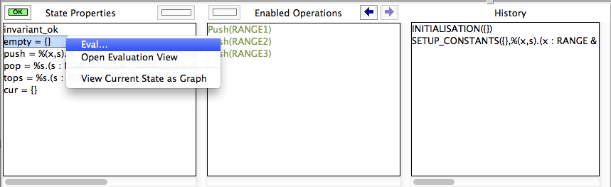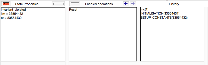 At that point during the animation (also reached directly if the B machine has no constants), ProB displays one or several initialise machine operations. The user selects one of these operations, and then the machine is in its initial state. The initial values of the variables are displayed in the State Properties pane and the initialise machine operation selected is displayed in the History. From that moment on, an indicator of the status of the invariant is displayed at the top of the State Properties pane and the backtrack operation is displayed at the bottom of the Enabled Operations pane. The invariant status indicator is invariant ok if the invariant is satisfied or invariant violated if the invariant is violated.