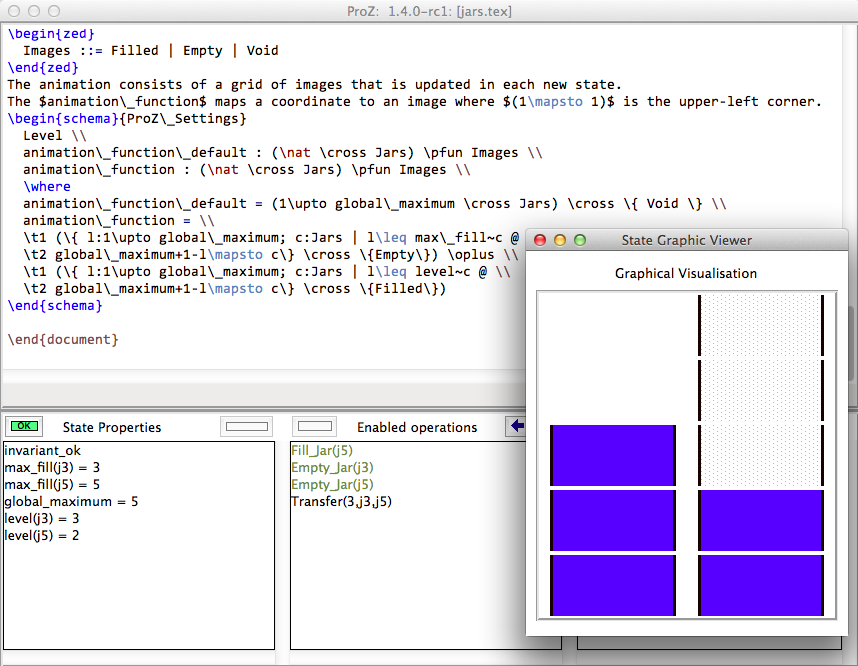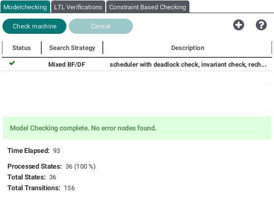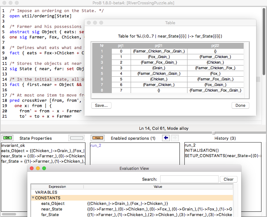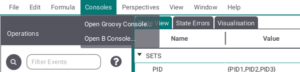 When the B specification is opened, the syntax and type checker analyses it and, if a syntax or type error is detected, it is then reported, highlighted in yellow in the specification. Furthermore, if the B specification contains features of B that are not supported by ProB or constraints that are not satisfiable, an appropriate message is displayed. When these checks are passed, the B machine is loaded, but it has no state yet. ProB will then display the operations that can be performed in the Enabled Operations pane. These operations can be of two types described below.