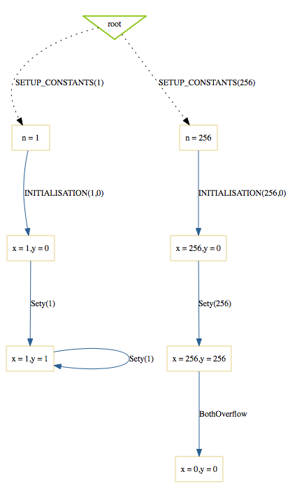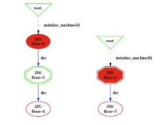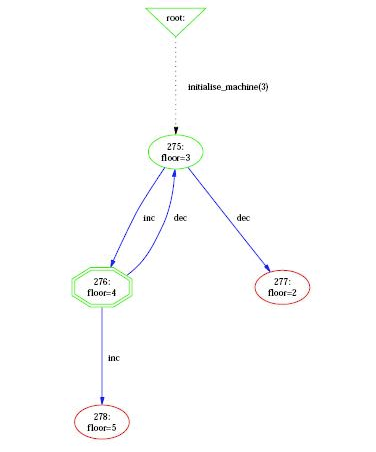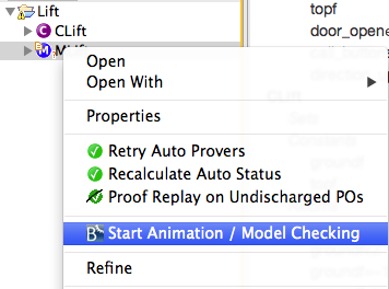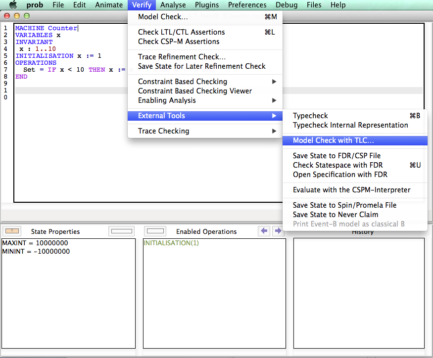 Several other commands are provided by ProB in the Animate menu for animating B specifications. The Reset command will set the state of the machine to the root, as if the machine has just been opened, i.e. when the initialise constants or initialise machine operations are displayed in the Enabled Operations pane. The Random Animation(10) command operates a sequence of 10 randomly chosen operations from the B specification. The variant Random Animation enables to specify the number of operation to operate randomly. In the File menu, the command Save State stores the current state of the B machine, which can then be reloaded with the command Load Saved State.