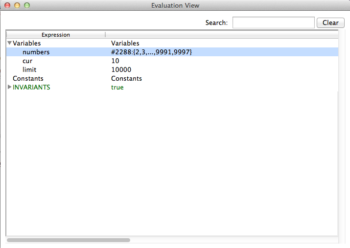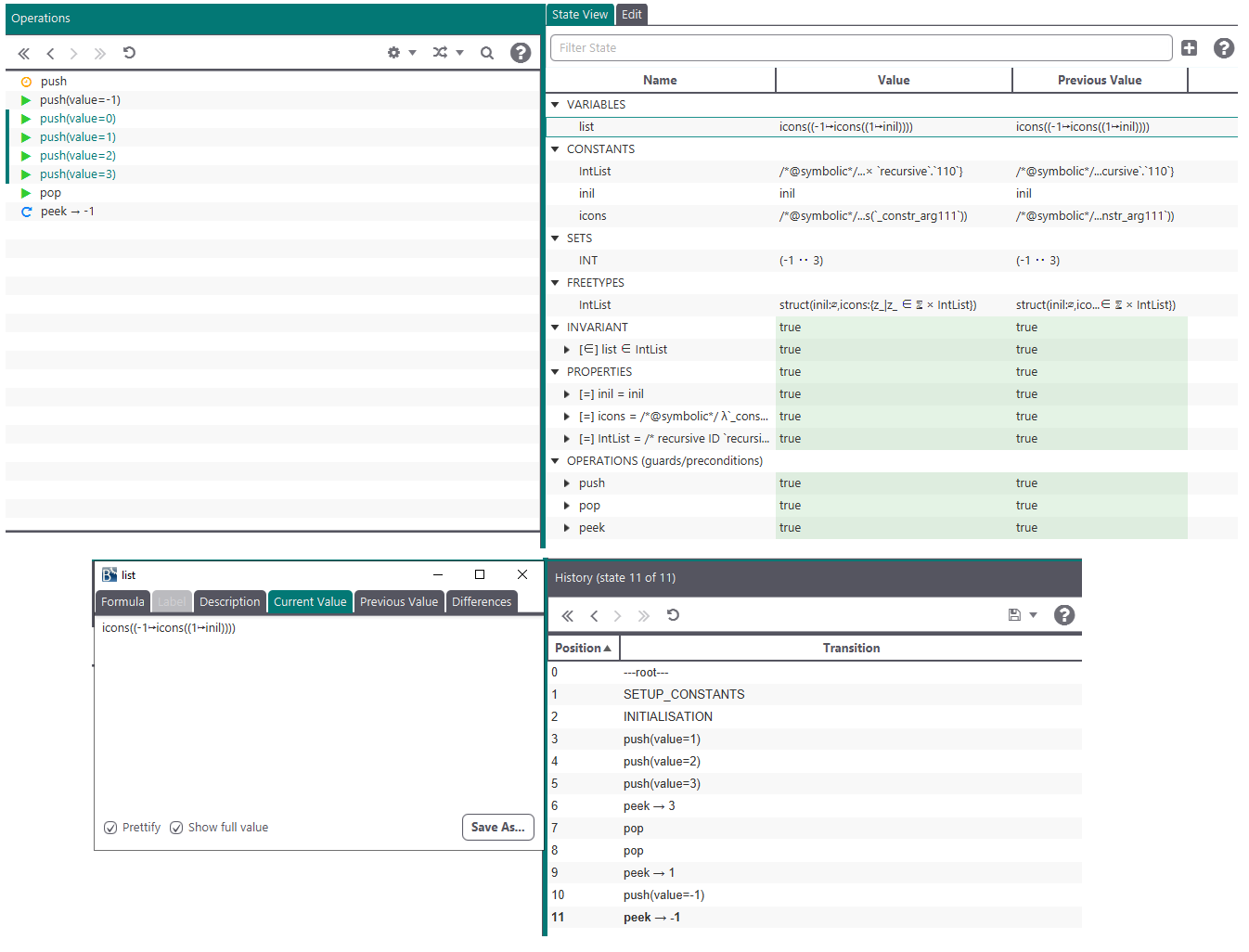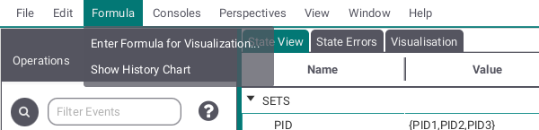 If the B machine has constants, one or several initialise constants operations are displayed. The user selects one of these operations, then the corresponding values of the constants are displayed in the State Properties pane and the selected initialise constants operation is displayed in the History pane. In the State Properties pane, functions and relations are displayed by indicating each of their tuples on a different line.