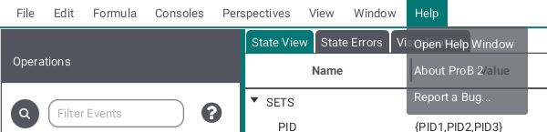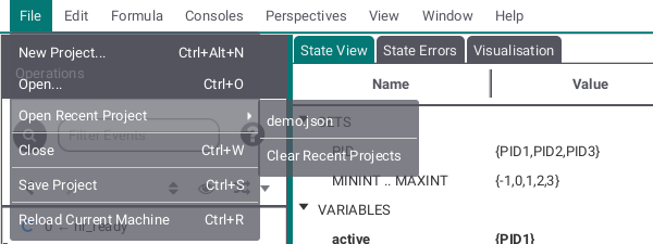 The menu bar contains the various commands to access the features of ProB. It includes the traditional "File" menu with a sub-menu "Recent Files" to quickly access the files previously opened in ProB. Notice the commands "Open\Save", "Reopen\Save" and "Reopen"; the latter reopens the currently opened file and reinitializes the state of the animation and the model checking processes completely. The "About" menu provides help on the tool and includes a command to check if an update is available on the ProB website. By default, ProB starts with a limited set of commands in the Beginner mode. The Normal mode gives access to more features and can be set in the menu "Preferences|User Mode".
