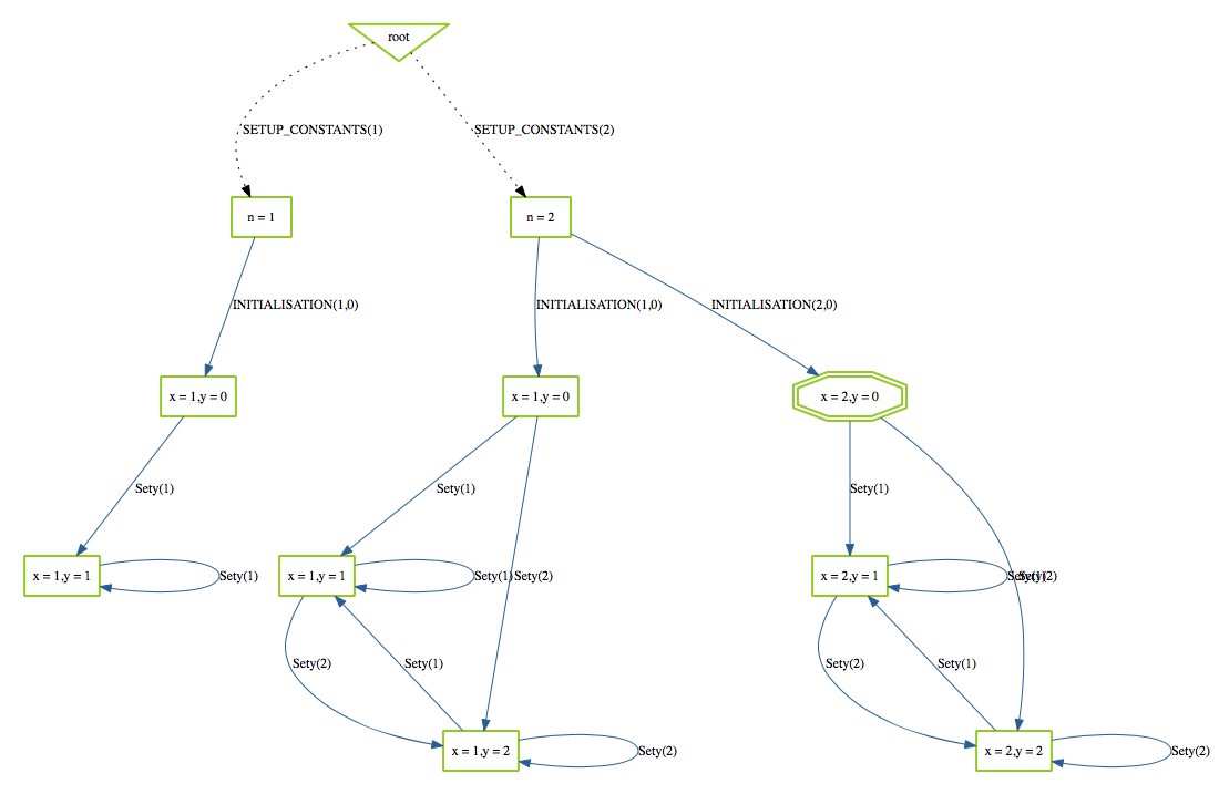 The computation of the parameter values greatly facilitates the work of the user, as he does not have to enumerate the possible values and check the preconditions and guards. This computation process involves trying to solve the various constraints imposed on the parameter values in the preconditions and guards.