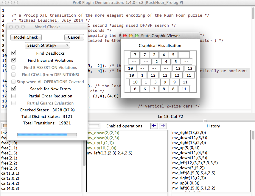 $ probcli -mc 100000 RushHour_Prolog.P -noinv --coverage tcltk_open_xtl_file(/Users/leuschel/git_root/prob_examples/public_examples/B/Puzzles/RushHour/RushHour_Prolog.P) new_xtl_file(/Users/leuschel/git_root/prob_examples/public_examples/B/Puzzles/RushHour/RushHour_Prolog.P) % All open nodes visited Model Checking Time: 1610 ms States analysed: 4780 Transitions fired: 29889 No Counter Example found. ALL nodes visited. Coverage: [STATES,deadlocked:0,open:0,live:4781,total:4781,TOTAL_OPERATIONS,29889,COVERED_OPERATIONS,mv_down:8461,mv_left:6483,mv_right:6483,mv_up:8461,start_xtl_system:1,UNCOVERED_OPERATIONS]