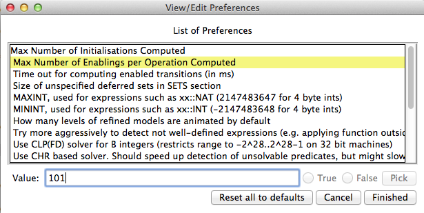 First, you could increase the "MAX_OPERATIONS" preference of ProB by selecting the "Animation Preferences" command in the "Preferences" menu: