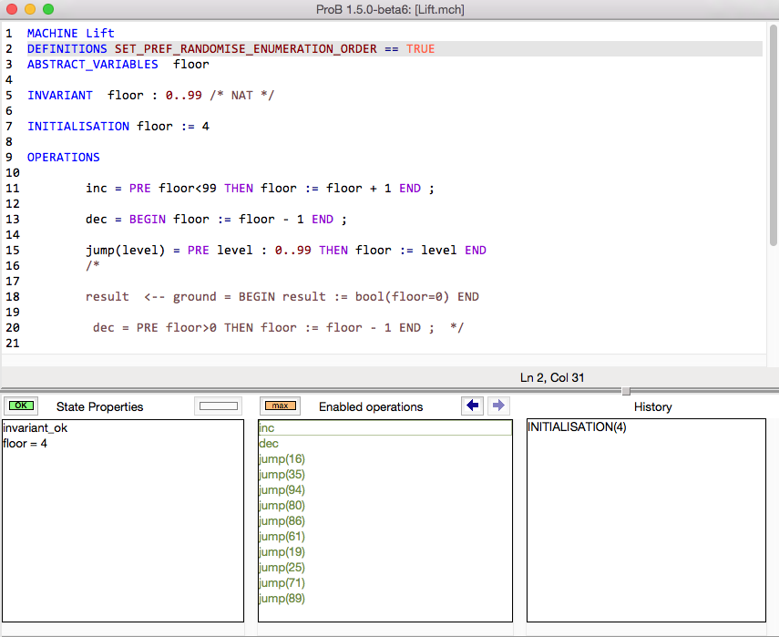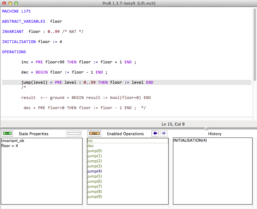 Make sure you have the Lift.mch model from the first part of the tutorial: Starting ProB and first animation steps.