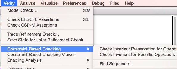 Now suppose we want to execute this new operation as early as possible. We can ask the constraint solver to generate a feasible sequence of operations. First select the "Find Sequence..." command in the Verify menu: