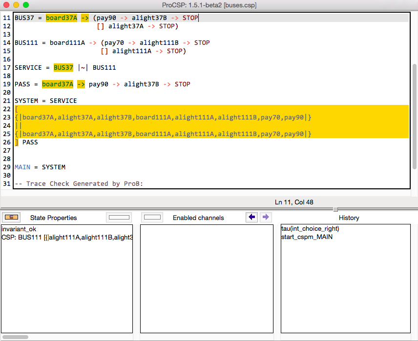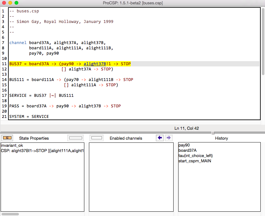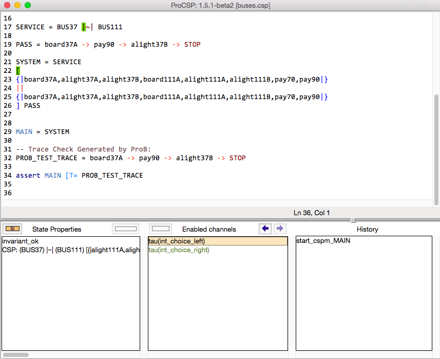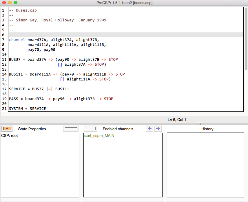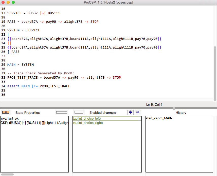 Use the "Open..." command in the "File" menu and then navigate to the "Examples" directory that came with your ProB installation. Inside the "CSP" subfolder, open the "buses.csp" specification. Your main ProB window should now look as follows: