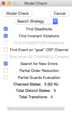 You can use the model checker to search for certain errors. Execute the "Model Check..." command in the "Verify Menu". The following dialog box will appear: