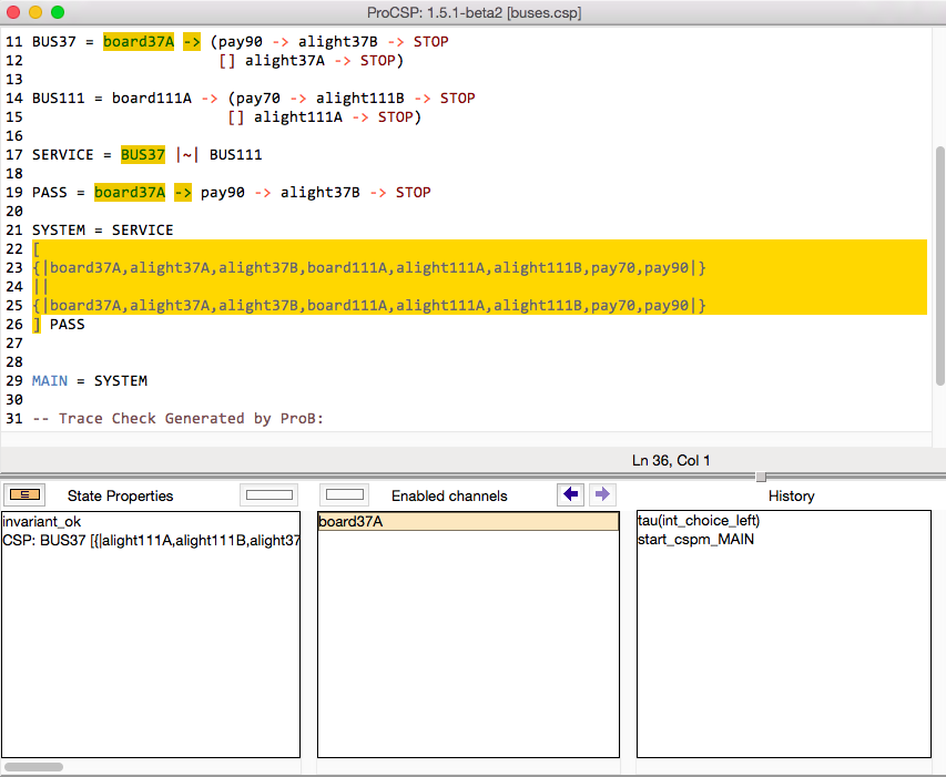 Now edit the definition of the BUS37 process and add an illegal output of value 1 on the alight37B channel: