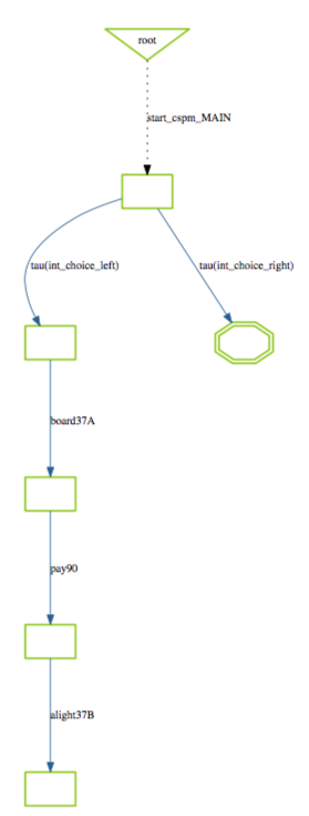 You can check more sophisticated temporal properties using the LTL model checker of ProB; see the corresponding part of the tutorial. For example, you can try and validate the following LTL formula G([board37A] => F [alight37B]). ProB should respond: Formula TRUE. No counterexample found. Similarly, you can check the absence of divergence by checking the LTL formula G not G [tau]. It is also possible to perform various refinement checks and other assertion checks (see Checking CSP Assertions' tutorial). The state space visualization features of ProB are also available for CSP; see the corresponding part of the tutorial. For example, if you select the command "Statespace" in the "Visualize" menu (after having fully explored the system), the following graph will be displayed: