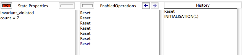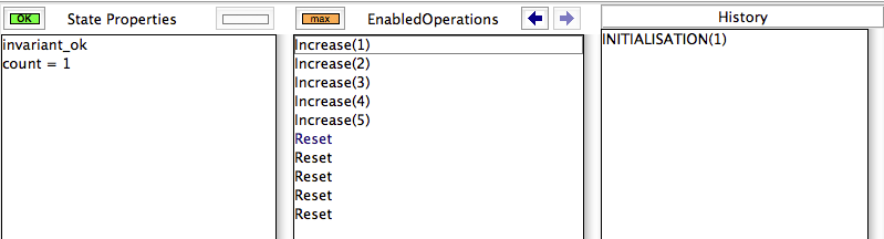 Note that the DEFINITION SET_PREF_MAX_OPERATIONS==5 means that ProB will compute at most 5 possible ways to execute any given operation (i.e., Increase and Reset in this case). We return to this issue below.