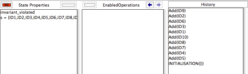 and repeat the model checking. We will get the exact same result as above, but this time the machine is actually incorrect. The only way to solve ensure that ProB checks the entire state space is to increase the "MAX_OPERATIONS" preference to a suitably large value, e.g., SET_PREF_MAX_OPERATIONS==8 in this case. Now model checking will find a counter example: