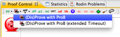 : The proof obligation editor in Rodin presents the user with a number of Hypotheses and one Goal, to be proved. If the Disprover is installed, it is available in the tool bar alongside the other provers: