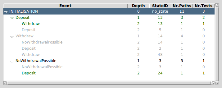 The constraint-based test case generation can be started by selecting Analyse > "Testing" > "constraint-based test case generation...". In the appearing window one can set the same parameters as described before (except for the maximum number of states). Clicking on "View CBC Test Tree" in the window popping up will open another window showing the test cases.