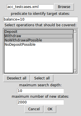 To start the test case generation select Analyse > "Testing" > "model-checking-based test case generation...". In the appearing window one can set some parameters: