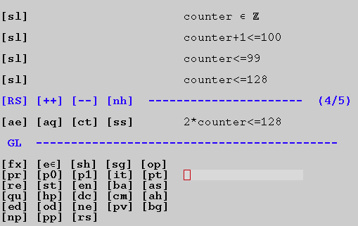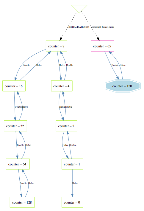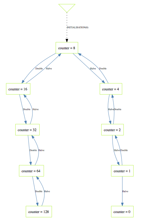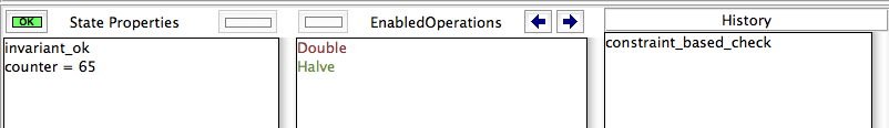 Now, while this state does not appear in the state space above either. However, this time this state does satisfy the invariant. Thus, if we ignore the initialization and just look at the INVARIANT counter:NATURAL & counter<=128 as describing all possible states, then the machine is indeed erroneous: the operation Double lead us outside of the safe states. The operation Halve on the other hand is correct: for every possible state satisfying the INVARIANT the resulting successor state will also satisfy the INVARIANT.