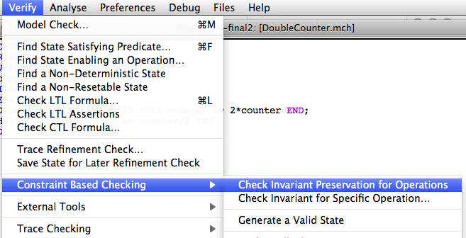 Let us choose the "Check Invariant Preservation for Operation" command inside the "Constraint Based Checking" submenu: