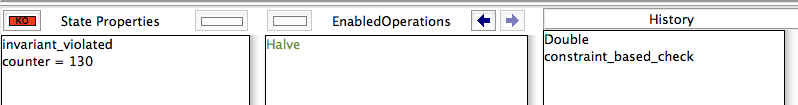 As you can see, the Counter has the value 130, which clearly violates the invariant counter<=128. However, no value in the state space above had this value for Counter. So how did we reach this error state? By pressing the left arrow in the "EnabledOperations" pane you will see the previous state that ProB has computed: