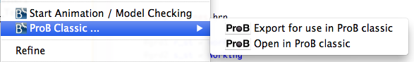 You can also start up ProB Classic (aka ProB Tcl/Tk) directly, without first generating an ".eventb" file. For this, start by right clicking (control Click on the Mac) on the machine or context in the "Event-B Explorer" view you wish to validate and select "ProB Classic.../Open in ProB classic":