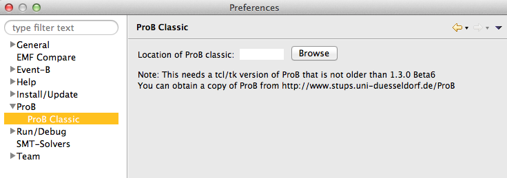 For this to work, you first need to open the ProB Classic preferences and then click on "Browse" to locate your installation of ProB Classic (which you can obtain from the ProB download site (we usually recommend the nightly-build version).