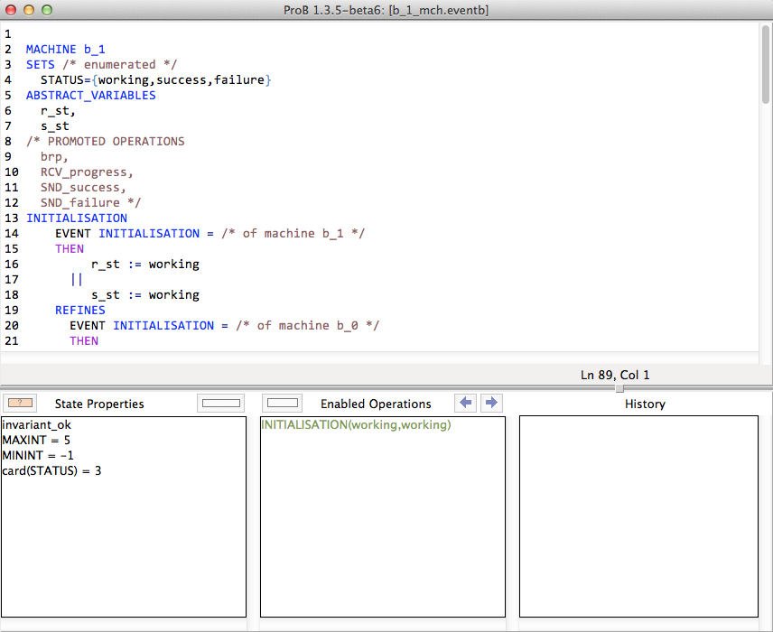 Again, all features applicable to B models also work with Event-B models. The source frame of ProB will show an ASCII rendering of the Event-B models. Note that all contexts and ancestor machines are merged into a single ".eventb" project file.