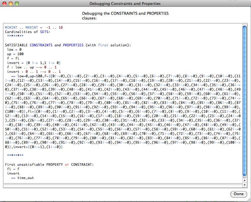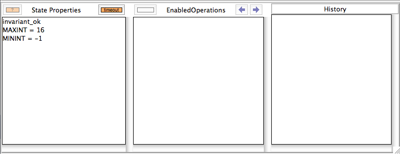 This will hopefully help us pinpoint the error in our properties. More recent versions of ProB also have a "Minimize" button in the lower left corner of the above dialog, in order to compute a minimal set of inconsistent properties. See Tutorial Troubleshooting the Setup for more ways to locate problems in the properties. After clicking "Done", we get the following; observe the orange timeout button in the "State Properties" pane: