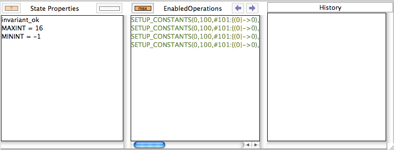 You can see that ProB had no problem with this machine. Still, one may wonder why it only proposes four solutions for the constants. Indeed, there should be 2^101 = 2.54e+30 different solutions (over 2 thousand billion billion billion solutions). In fact, as quite often there are a lot of solutions for the constants, ProB (luckily) does not compute all of them. Indeed, there is a cut-off point after which it will no longer search for more solutions. In this case, the orange button "max" appears in the "Enabled Operatoins" pane. The cut-off itself is controlled by a preference. You can either