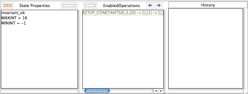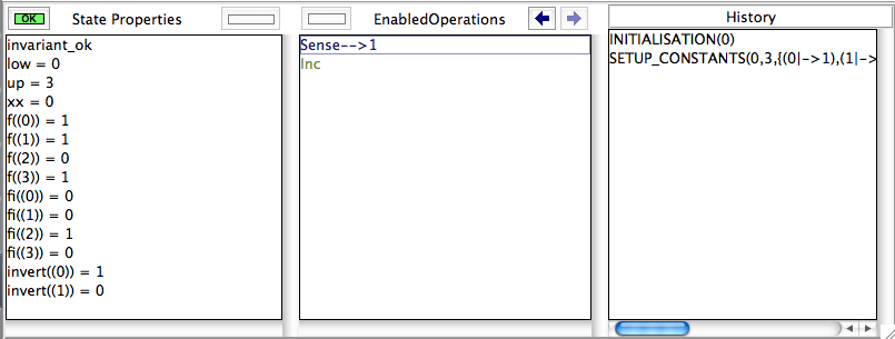After selecting SETUP_CONSTANTS and INITIALISATION, we obtain the following state, and we can ensure ourselves that the values found for f and fi are correct (by looking at the "State Properties" pane):