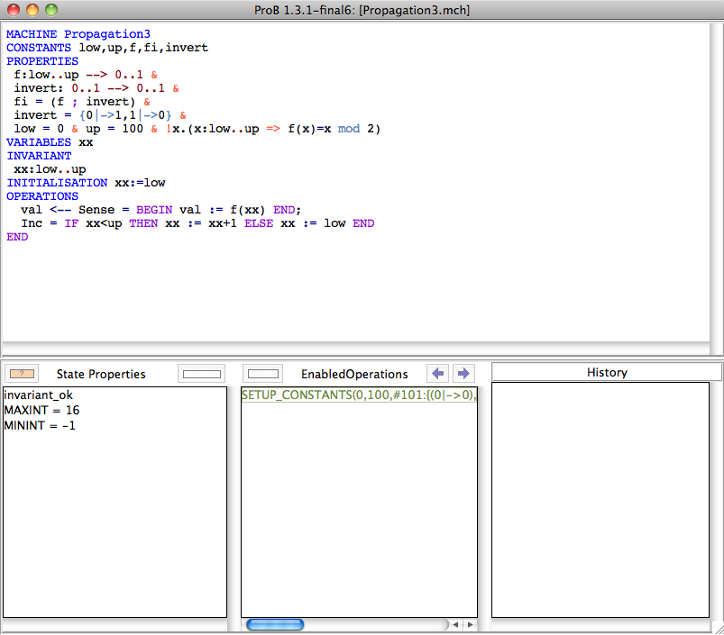 Finally, in the current version of ProB (1.3) it is better to use !x.(x:low..up => f(x)=x mod 2) rather than the seemingly equivalent !x.(x>=low & x<=up => f(x)=x mod 2). The former version is currently more efficient especially for large values of MAXINT and MININT. (But we are planning to overcome this issue.)