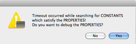 Note that one can click on the orange Timeout button: this will offer us the option to try to find solutions without a timeout. You should use this option with care: it can lock up your computer for a long time. You should be able to stop the computation by selecting ProB's terminal window and hitting CONTROL-C. Hopefully, the following message will appear in the terminal: