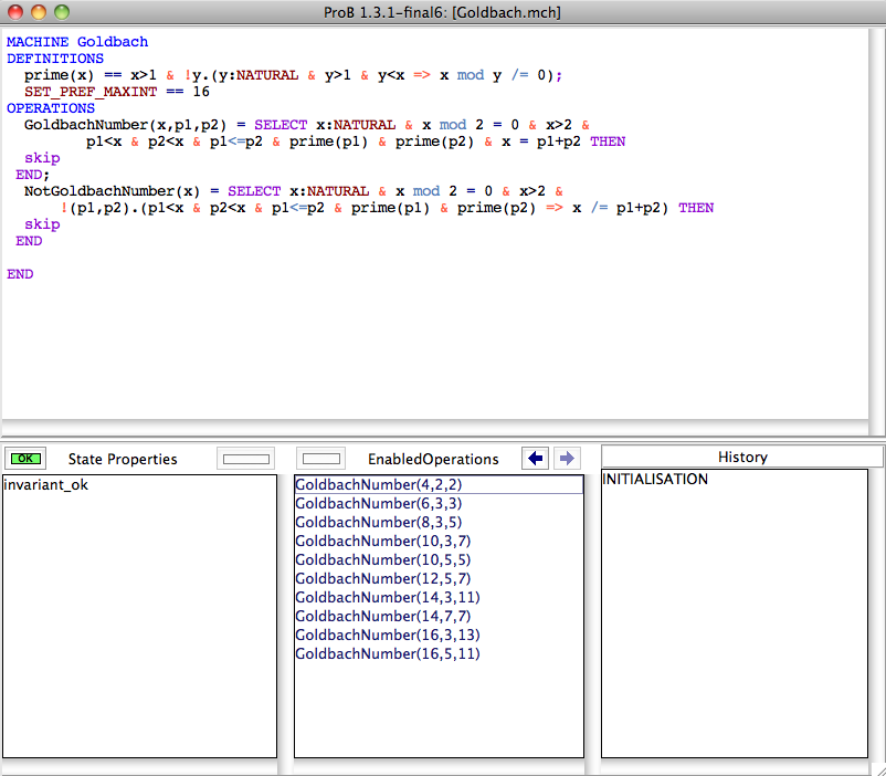 Hence, ProB will look for solutions to the parameter x of NotGoldbachNumber only until MAXINT. Hence, if we set MAXINT to 16 (adding a definiton SET_PREF_MAXINT == 16) we get the following picture after executing the INITIALISATION: