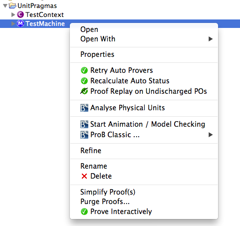 The supplied units can now be used by ProB to infer missing units, verify the supplied units and detect unit errors. To start the analysis use the context menu of the machine / context you want to analyse: